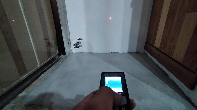 レーザー距離計の使い方もとても簡単。下の画像のように距離を測りたい場所の起点に立って、測りたい終点の場所にレーザーポイントを当てるだけです。