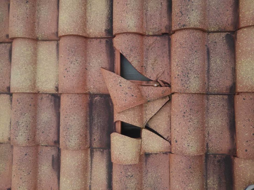 台風の時に何かかが飛んできたのか、中古住宅の建物点検時に瓦が2枚割れているのを発見しました。