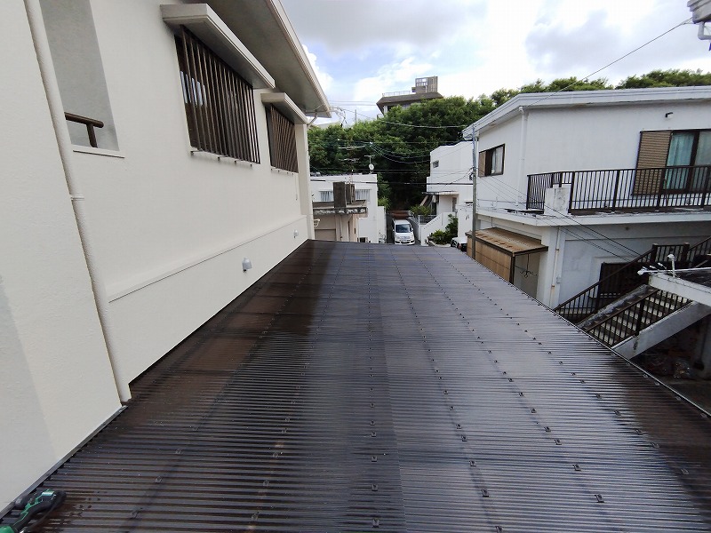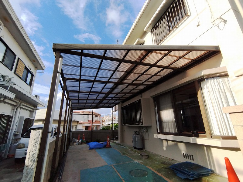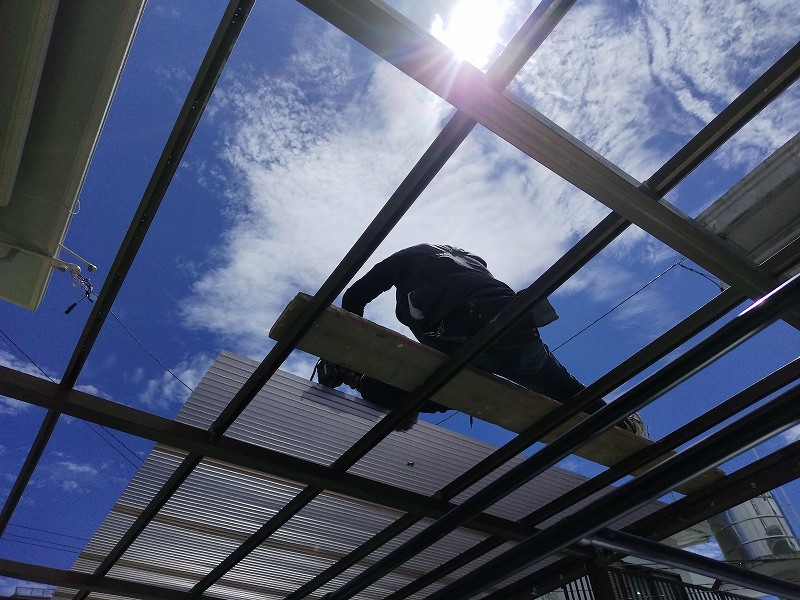 屋根材のポリカ(ポリカーボネートの略)を張替える作業になりますが、面積が広い上に、結構高さがあります。