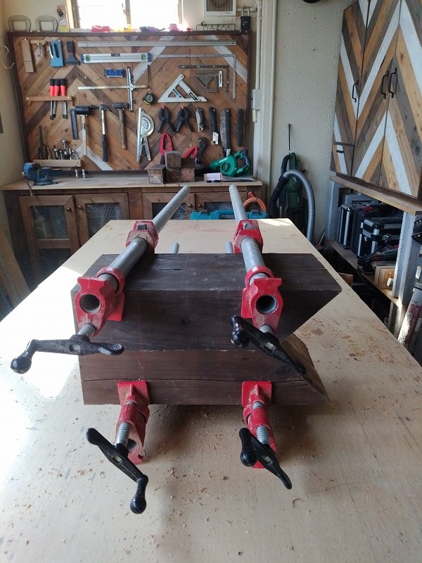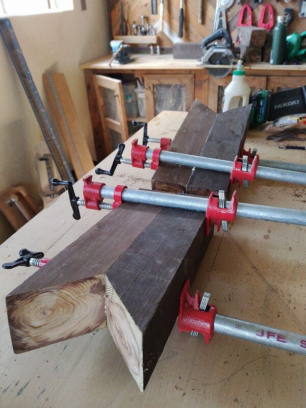 まずは90mmの角材の端材2本をビスケットとボンドで圧着。