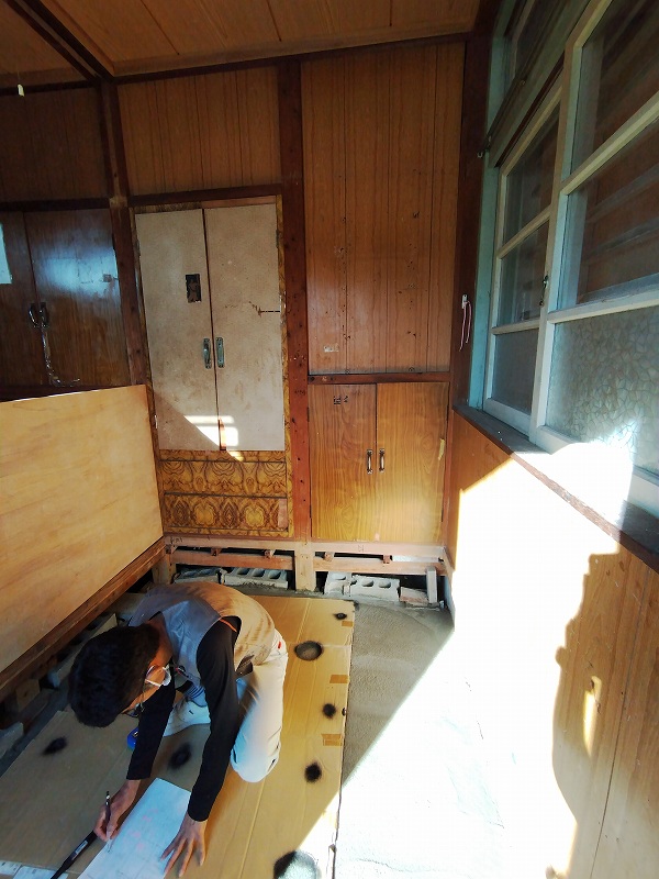 給水管、お湯管、トイレの排水管、シャワールームの排水管、ユニットの脚の位置などが書いていきます。