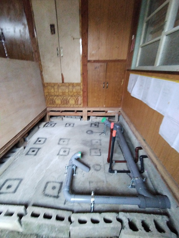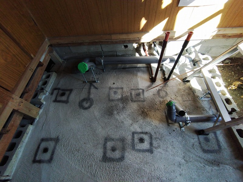 その後墨出し作業、上下水道配管工事、排気管工事を行いました。