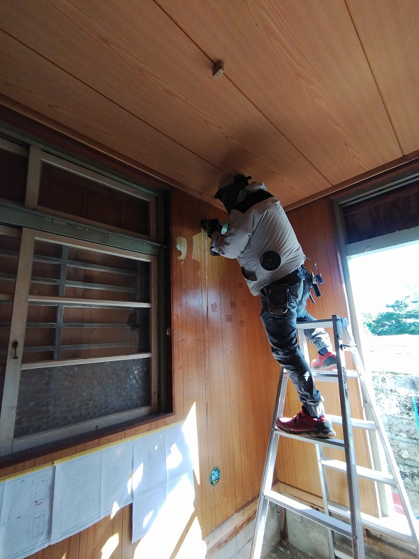 続いて、換気用に壁に穴を開けて、じゃばら管と排気フードを取り付けます。