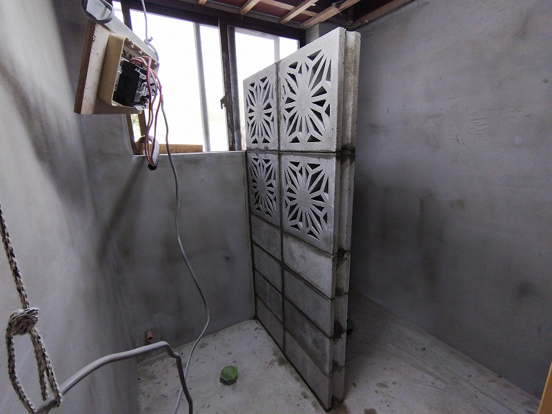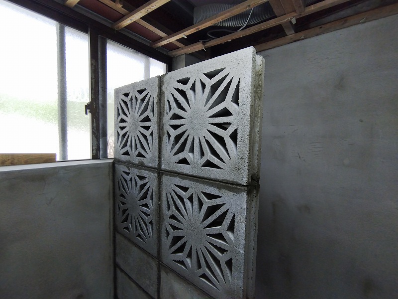 トイレ兼浴室の花ブロック積み。