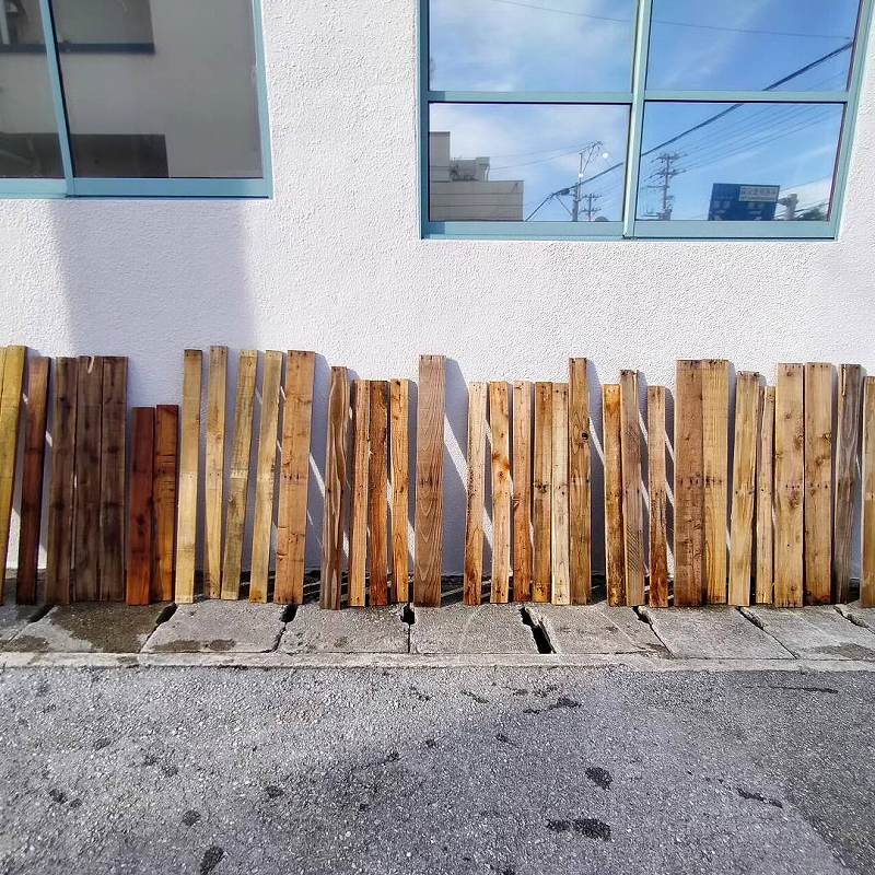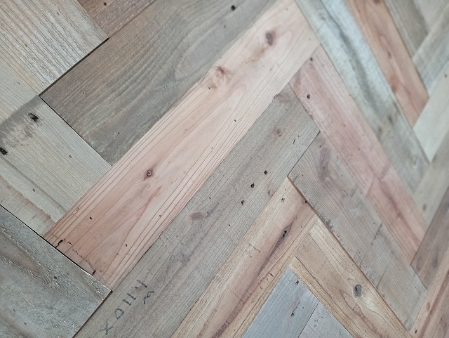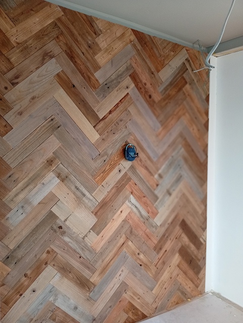 こちらは、廃パレットを加工して壁材に使用しています。