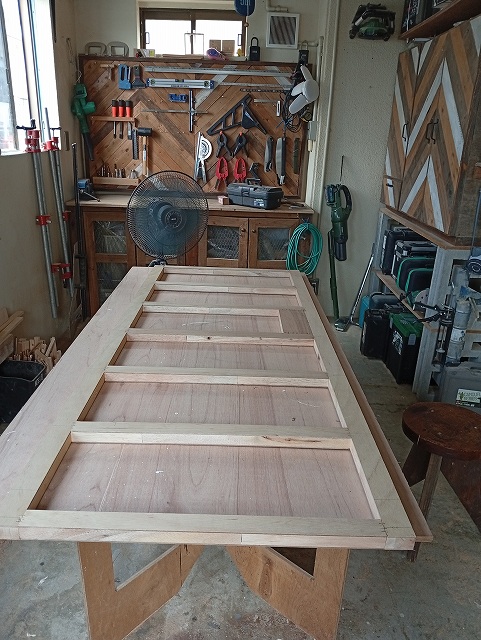 心材で骨を組んで、メラミン化粧板を太鼓張りしていきます。
