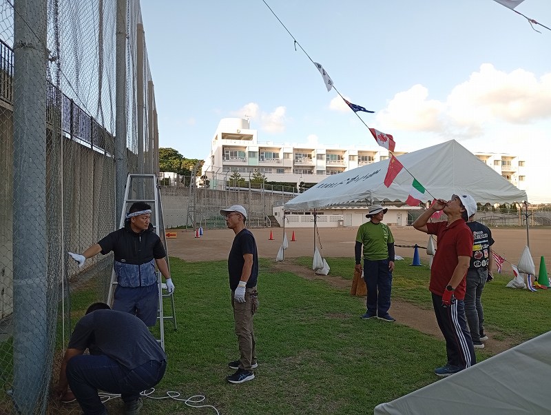 そして午後からは、明日、運動会が行われる娘の小学校の万国旗設置へ。