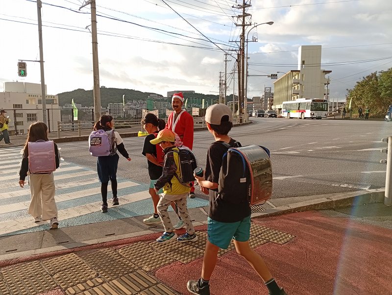 そんなわけで、今朝はサンタの恰好で交通安全の旗振り。
