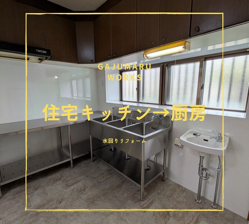 Works キッチン→厨房化工事 G@KK 2026年3月20日 みなさんこんにちは!沖縄県豊見城市で「安心できる中古住宅購入と住宅リホームの専門店」をしているガクシです! さて、前回は「感動でいっぱい」というお話でした。今回は「キッチン→厨房化工事」というお話です。 豊見城市にお住まいのお客様より 「自宅で軽食のお店をしたい」とのことで、住宅のキッチンを厨房へリフォームさせて頂きました。【before】 【既存キッチン撤去】 【after】 オープンが楽しみです。U様これから開業に向けて頑張って下さい!というわけで、じゅうをもっとじゆうに♪